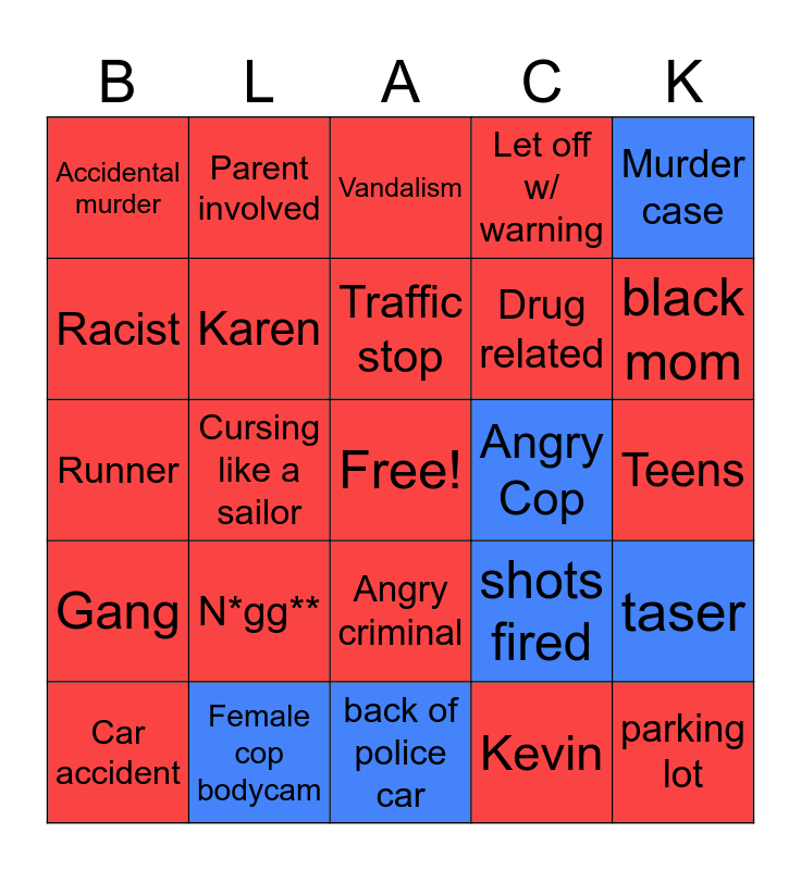This bingo card has a free space and 24 words: N*gg**, Female cop bodycam, Traffic stop, Car accident, Murder case, Accidental murder, Racist, Parent involved, Angry Cop, Angry criminal, Drug related, Runner, shots fired, taser, Karen, Kevin, Teens, Vandalism, black mom, Cursing like a sailor, parking lot, Gang, Let off w/ warning and back of police car.