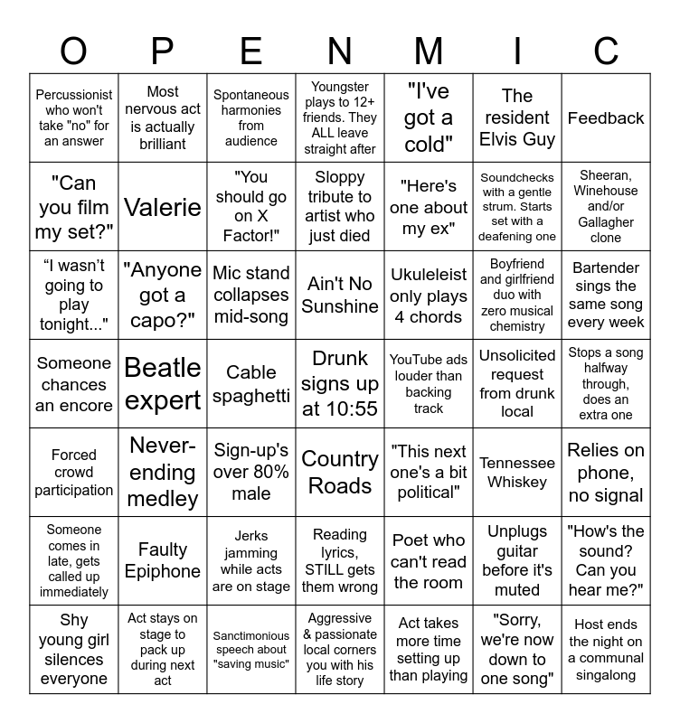 This bingo card has 49 words: Someone comes in late, gets called up immediately, "Anyone got a capo?", Jerks jamming while acts are on stage, Country Roads, Ukuleleist only plays 4 chords, Unsolicited request from drunk local, Feedback, Shy young girl silences everyone, Valerie, Cable spaghetti, Sloppy tribute to artist who just died, "I've got a cold", Soundchecks with a gentle strum. Starts set with a deafening one, Bartender sings the same song every week, Forced crowd participation, Never-ending medley, Spontaneous harmonies from audience, Ain't No Sunshine, Act takes more time setting up than playing, The resident Elvis Guy, Sheeran, Winehouse and/or Gallagher clone, "Can you film my set?", Most nervous act is actually brilliant, "You should go on X Factor!", Aggressive & passionate local corners you with his life story, "Here's one about my ex", Boyfriend and girlfriend duo with zero musical chemistry, "How's the sound? Can you hear me?", Percussionist who won't take "no" for an answer, Beatle expert, Sanctimonious speech about "saving music", Reading lyrics, STILL gets them wrong, "This next one's a bit political", Unplugs guitar before it's muted, Stops a song halfway through, does an extra one, Someone chances an encore, Faulty Epiphone, Sign-up's over 80% male, Drunk signs up at 10:55, YouTube ads louder than backing track, "Sorry, we're now down to one song", Relies on phone, no signal, “I wasn’t going to play tonight...", Act stays on stage to pack up during next act, Mic stand collapses mid-song, Youngster plays to 12+ friends. They ALL leave straight after, Poet who can't read the room, Tennessee Whiskey and Host ends the night on a communal singalong.