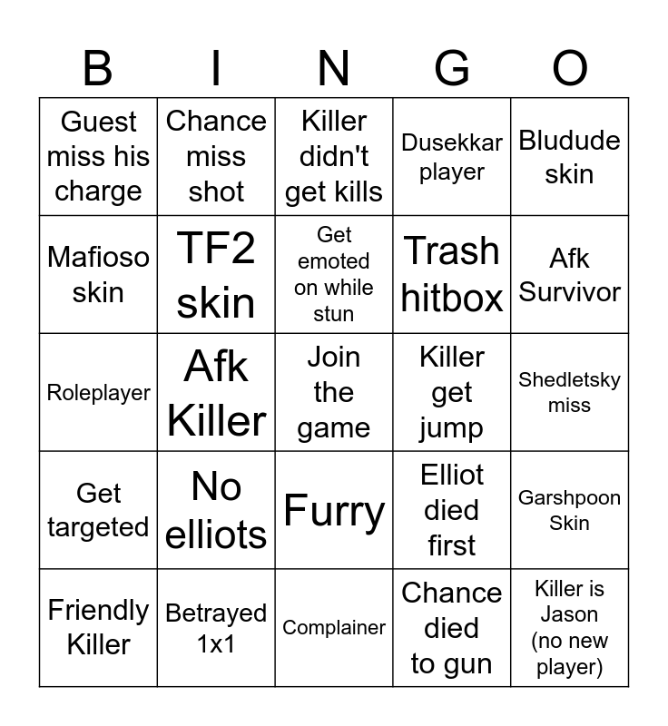 This bingo card has a free space and 24 words: No elliots, Betrayed 1x1, Get emoted on while stun, Friendly Killer, Bludude skin, Guest miss his charge, Mafioso skin, Chance miss shot, Killer get jump, Furry, Trash hitbox, Roleplayer, Elliot died first, Garshpoon Skin, TF2 skin, Chance died to gun, Shedletsky miss, Killer didn't get kills, Afk Survivor, Afk Killer, Killer is Jason (no new player), Get targeted, Dusekkar player and Complainer.