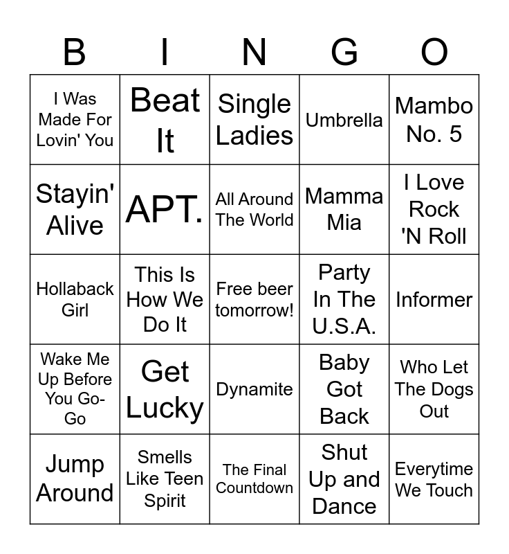 This bingo card has a free space and 44 words: Party Rock Anthem, Everytime We Touch, DJ Got Us Fallin' In Love, Jump Around, I Gotta Feeling, Shut Up and Dance, Single Ladies, Another One Bites The Dust, Mambo No. 5, Smells Like Teen Spirit, Umbrella, Party In The U.S.A., Dynamite, Get Lucky, U Can't Touch This, The Final Countdown, Wannabe, Hollaback Girl, Kung Fu Fighting, I Love Rock 'N Roll, Beat It, Whistle, Summer Of '69, I Was Made For Lovin' You, You Spin Me Round, Informer, What Is Love, One More Time, Baby Got Back, Wake Me Up Before You Go-Go, 24K Magic, Who Let The Dogs Out, Cotton Eye Joe, Timber, This Is How We Do It, Move Ya Body, Barbra Streisand, Uptown Funk, All Around The World, Stayin' Alive, Mamma Mia, Jessie's Girl, APT. and Forget You.