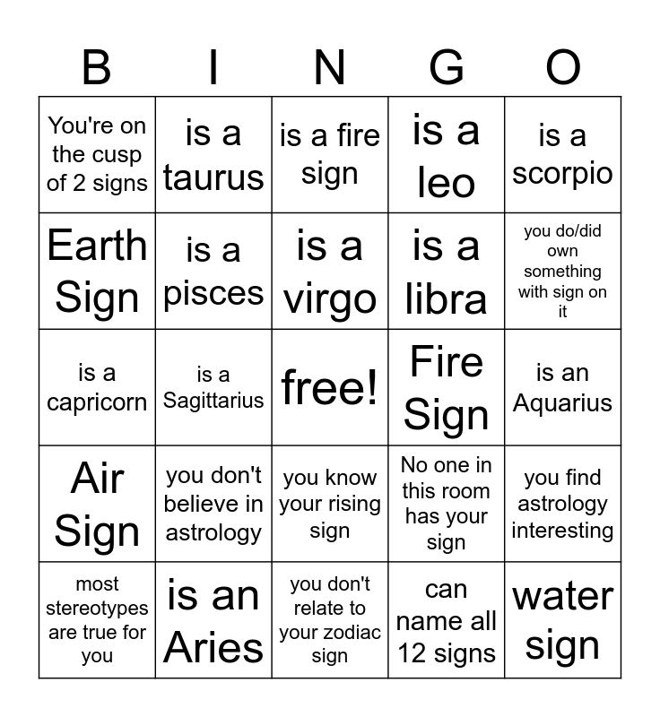 This bingo card has a free space and 24 words: most stereotypes are true for you, you don't believe in astrology, is a virgo, can name all 12 signs, is a scorpio, You're on the cusp of 2 signs, is a taurus, is a fire sign, Fire Sign, is an Aquarius, is a capricorn, is a pisces, No one in this room has your sign, you find astrology interesting, Earth Sign, is an Aries, you don't relate to your zodiac sign, is a leo, you do/did own something with sign on it, Air Sign, is a Sagittarius, you know your rising sign, is a libra and water sign.