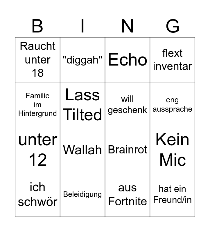 This bingo card has 16 words: Beleidigung, Kein Mic, Echo, Raucht unter 18, unter 12, "diggah", Brainrot, aus Fortnite, Familie im Hintergrund, Lass Tilted, ich schwör, flext inventar, Wallah, eng aussprache, will geschenk and hat ein Freund/in.