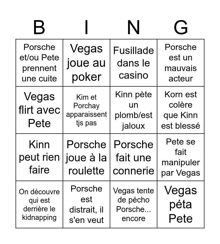 This bingo card has 16 words: Porsche est distrait, il s'en veut, Pete se fait manipuler par Vegas, Fusillade dans le casino, Porsche et/ou Pete prennent une cuite, Kinn peut rien faire, Vegas joue au poker, Porsche fait une connerie, Vegas tente de pécho Porsche... encore, Vegas flirt avec Pete, Kim et Porchay apparaissent tjs pas, On découvre qui est derrière le kidnapping, Porsche est un mauvais acteur, Porsche joue à la roulette, Korn est colère que Kinn est blessé, Kinn pète un plomb/est jaloux and Vegas péta Pete.