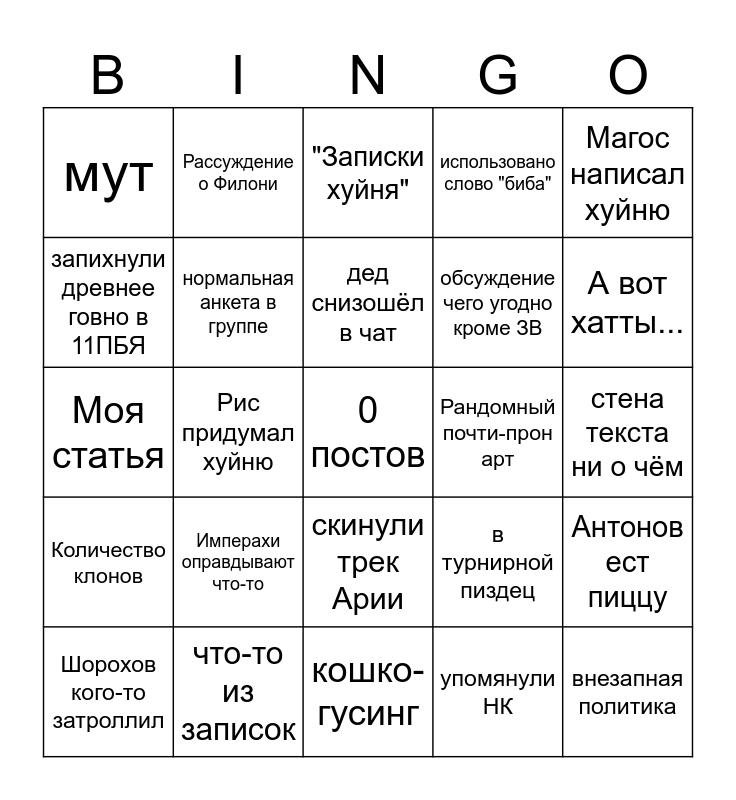 This bingo card has a free space and 24 words: Имперахи оправдывают что-то, что-то из записок, дед снизошёл в чат, Шорохов кого-то затроллил, Магос написал хуйню, мут, запихнули древнее говно в 11ПБЯ, Рассуждение о Филони, Рандомный почти-прон арт, скинули трек Арии, обсуждение чего угодно кроме ЗВ, Моя статья, в турнирной пиздец, Антонов ест пиццу, нормальная анкета в группе, упомянули НК, стена текста ни о чём, "Записки хуйня", А вот хатты..., Рис придумал хуйню, внезапная политика, Количество клонов, использовано слово "биба" and кошко-гусинг.