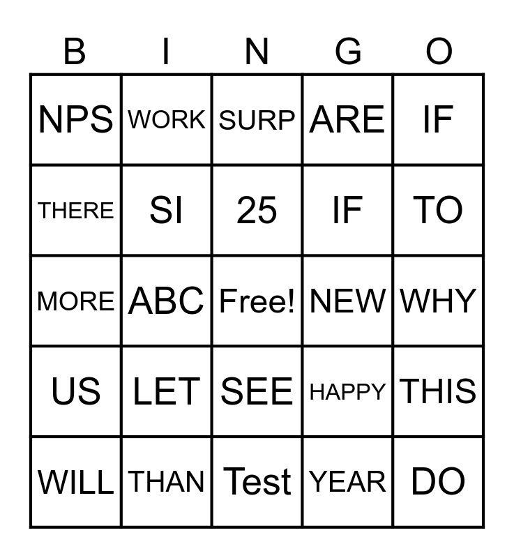 This bingo card has a free space and 31 words: Test, SOW, ABC, PFTI, NPS, SURP, SI, HAPPY, NEW, YEAR, WHY, DO, I, NEED, TO, DO, THIS, LET, US, SEE, IF, THIS, WILL, WORK, IF, THERE, ARE, MORE, THAN, 25 and NUMBERS.