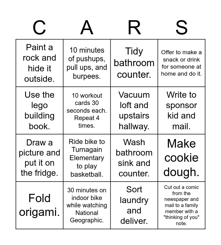 This bingo card has 16 words: Fold origami., 30 minutes on indoor bike while watching National Geographic., Tidy bathroom counter., Offer to make a snack or drink for someone at home and do it., Use the lego building book., 10 minutes of pushups, pull ups, and burpees., Wash bathroom sink and counter., Make cookie dough., Paint a rock and hide it outside., 10 workout cards 30 seconds each. Repeat 4 times., Sort laundry and deliver., Write to sponsor kid and mail., Draw a picture and put it on the fridge., Ride bike to Turnagain Elementary to play basketball., Vacuum loft and upstairs hallway. and Cut out a comic from the newspaper and mail to a family member with a "thinking of you" note..