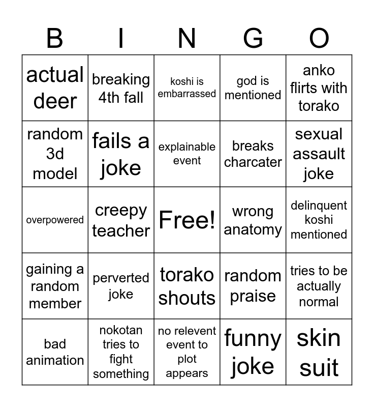 This bingo card has a free space and 24 words: perverted joke, nokotan tries to fight something, explainable event, bad animation, anko flirts with torako, actual deer, random 3d model, breaking 4th fall, wrong anatomy, torako shouts, breaks charcater, overpowered, random praise, tries to be actually normal, fails a joke, funny joke, delinquent koshi mentioned, koshi is embarrassed, sexual assault joke, creepy teacher, skin suit, gaining a random member, god is mentioned and no relevent event to plot appears.