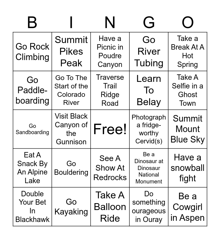 This bingo card has a free space and 24 words: Go Bouldering, Go Kayaking, Traverse Trail Ridge Road, Double Your Bet In Blackhawk, Take a Break At A Hot Spring, Go Rock Climbing, Go Paddle-boarding, Summit Pikes Peak, Photograph a fridge-worthy Cervid(s), See A Show At Redrocks, Learn To Belay, Go Sandboarding, Be a Dinosaur at Dinosaur National Monument, Have a snowball fight, Go To The Start of the Colorado River, Do something ourageous in Ouray, Summit Mount Blue Sky, Have a Picnic in Poudre Canyon, Take A Selfie in a Ghost Town, Visit Black Canyon of the Gunnison, Be a Cowgirl in Aspen, Eat A Snack By An Alpine Lake, Go River Tubing and Take A Balloon Ride.