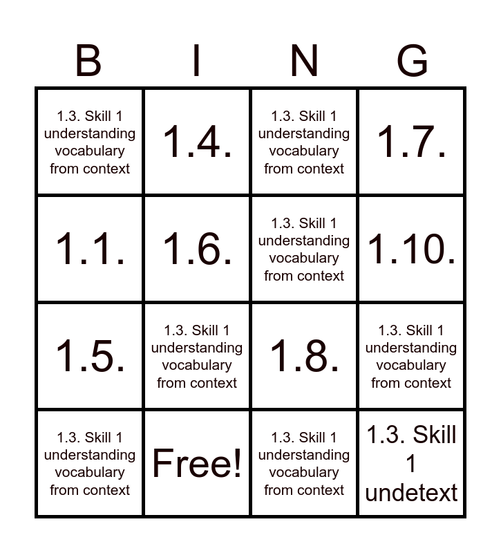 This bingo card has 31 words: 1.3. Skill 1 understanding vocabulary from context, 1.3. Skill 1 understanding vocabulary from context, 1.3. Skill 1 understanding vocabulary from context, 1.3. Skill 1 understanding vocabulary from context, 1.3. Skill 1 understanding vocabulary from context, 1.3. Skill 1 understanding vocabulary from context, 1.3. Skill 1 understanding vocabulary from context, 1.3. Skill 1 understanding vocabulary from context, Free!, 1.3. Skill 1 understanding vocabulary from context, 1.3. Skill 1 understanding vocabulary from context, 1.3. Skill 1 understanding vocabulary from context, 1.3. Skill 1 understanding vocabulary from context, 1.3. Skill 1 understanding vocabulary from context, 1.3. Skill 1 understanding vocabulary from context, 1.3. Skill 1 understanding vocabulary from context, 1.3.ext, context, 1.3. Skill 1 undetext, 1.3. Skill 1 understanding vot, 1.1., 1.2., 1.3., 1.4., 1.5., 1.6., 1.7., 1.8., 1.9., 1.10. and 1.11..