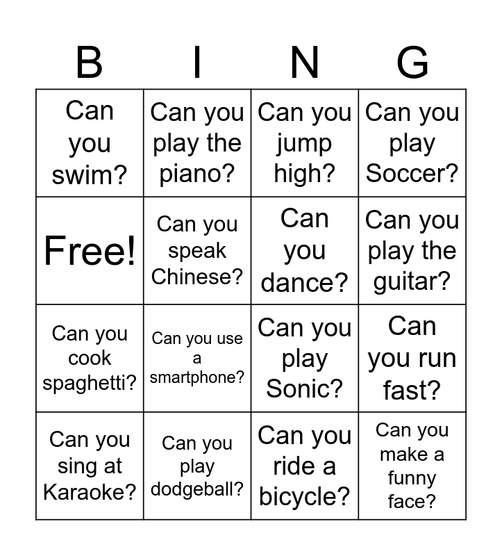 This bingo card has 16 words: Can you play dodgeball?, Can you run fast?, Can you jump high?, Can you swim?, Can you cook spaghetti?, Can you play the piano?, Can you play Sonic?, Can you ride a bicycle?, Free!, Can you speak Chinese?, Can you sing at Karaoke?, Can you play Soccer?, Can you use a smartphone?, Can you play the guitar?, Can you dance? and Can you make a funny face?.