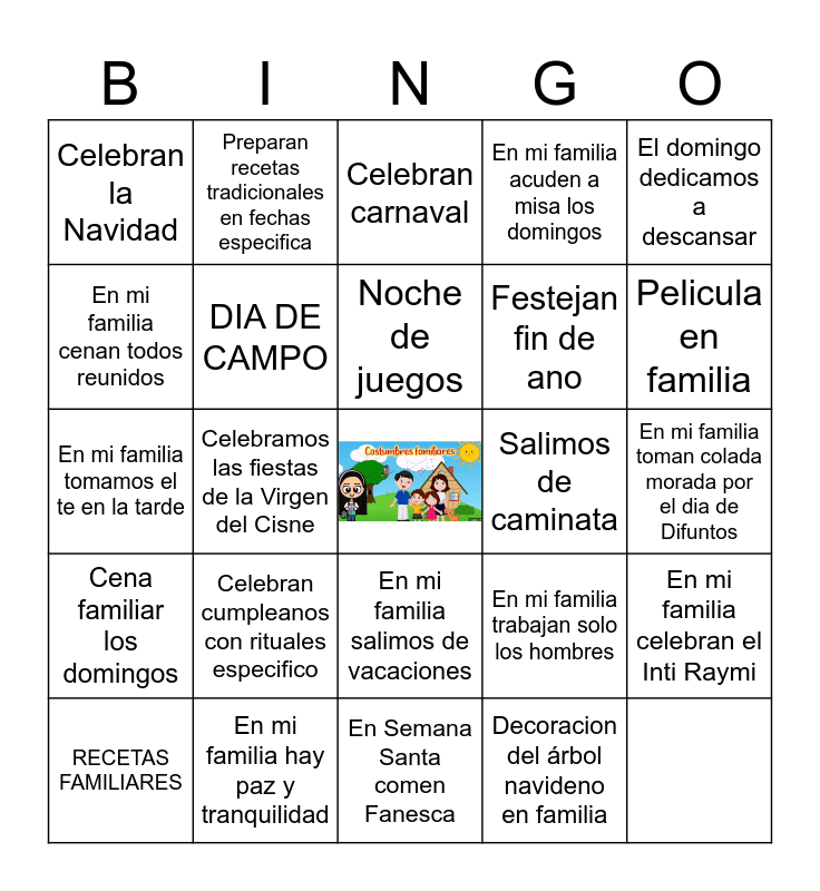 This bingo card has a free space and 25 words: Cena familiar los domingos, Celebran cumpleanos con rituales especifico, Noche de juegos, Decoracion del árbol navideno en familia, Pelicula en familia, Celebran la Navidad, Preparan recetas tradicionales en fechas especifica, Celebran carnaval, Festejan fin de ano, RECETAS FAMILIARES, DIA DE CAMPO, En Semana Santa comen Fanesca, En mi familia trabajan solo los hombres, En mi familia celebran el Inti Raymi, En mi familia cenan todos reunidos, En mi familia hay paz y tranquilidad, En mi familia salimos de vacaciones, En mi familia acuden a misa los domingos, En mi familia toman colada morada por el dia de Difuntos, En mi familia tomamos el te en la tarde, Celebramos las fiestas de la Virgen del Cisne, No nos banamos en Semana Santa, Salimos de caminata, El domingo dedicamos a descansar and Hacemos ayunos.