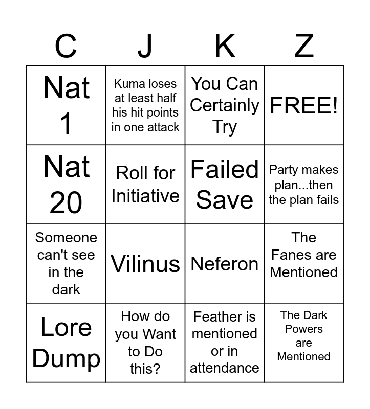 This bingo card has 16 words: How do you Want to Do this?, The Fanes are Mentioned, You Can Certainly Try, Nat 1, Someone can't see in the dark, Kuma loses at least half his hit points in one attack, Neferon, Feather is mentioned or in attendance, Nat 20, Roll for Initiative, Lore Dump, FREE!, Vilinus, Party makes plan...then the plan fails, Failed Save and The Dark Powers are Mentioned.