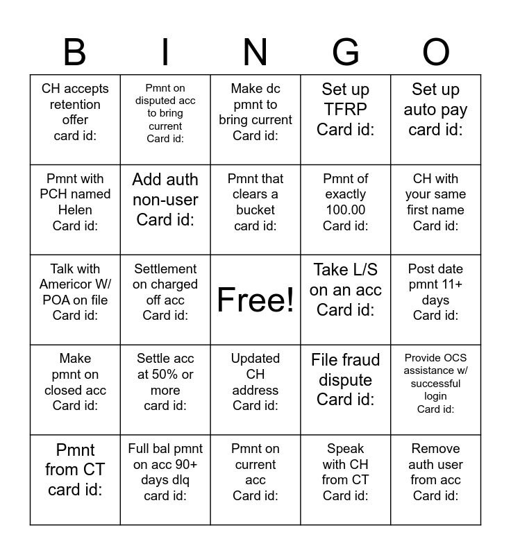 This bingo card has a free space and 24 words: Settle acc at 50% or more card id:, Full bal pmnt on acc 90+ days dlq card id:, Pmnt that clears a bucket card id:, Pmnt from CT card id:, Set up auto pay card id:, CH accepts retention offer card id:, Pmnt with PCH named Helen Card id:, Pmnt on disputed acc to bring current Card id:, Take L/S on an acc Card id:, Updated CH address Card id:, Pmnt of exactly 100.00 Card id:, Talk with Americor W/ POA on file Card id:, File fraud dispute Card id:, Provide OCS assistance w/ successful login Card id:, Add auth non-user Card id:, Speak with CH from CT Card id:, Post date pmnt 11+ days Card id:, Make dc pmnt to bring current Card id:, CH with your same first name Card id:, Settlement on charged off acc Card id:, Remove auth user from acc Card id:, Make pmnt on closed acc Card id:, Set up TFRP Card id: and Pmnt on current acc Card id:.