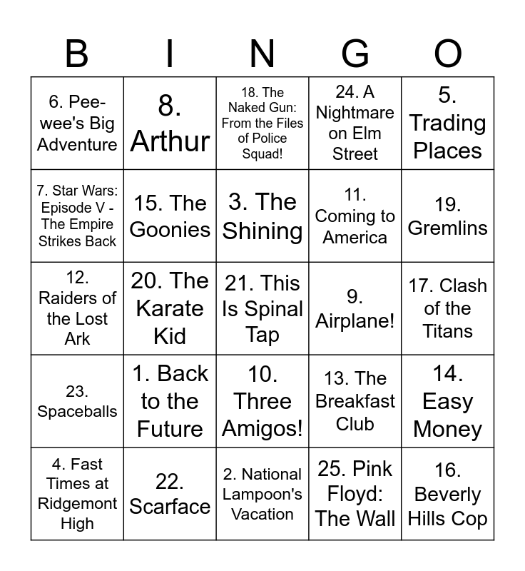 This bingo card has 25 words: 1. Back to the Future, 2. National Lampoon's Vacation, 3. The Shining, 4. Fast Times at Ridgemont High, 5. Trading Places, 6. Pee-wee's Big Adventure, 7. Star Wars: Episode V - The Empire Strikes Back, 8. Arthur, 9. Airplane!, 10. Three Amigos!, 11. Coming to America, 12. Raiders of the Lost Ark, 13. The Breakfast Club, 14. Easy Money, 15. The Goonies, 16. Beverly Hills Cop, 17. Clash of the Titans, 18. The Naked Gun: From the Files of Police Squad!, 19. Gremlins, 20. The Karate Kid, 21. This Is Spinal Tap, 22. Scarface, 23. Spaceballs, 24. A Nightmare on Elm Street and 25. Pink Floyd: The Wall.