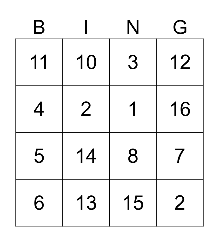 This bingo card has 17 words: 15, 6, 3, 11, 14, 12, 7, 1, 16, 2, 13, 8, 4, 10, 5, 9 and 2.