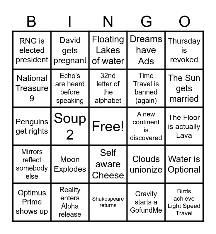 This bingo card has a free space and 24 words: Moon Explodes, Reality enters Alpha release, 32nd letter of the alphabet, Optimus Prime shows up, Thursday is revoked, RNG is elected president, National Treasure 9, David gets pregnant, A new continent is discovered, Self aware Cheese, Time Travel is banned (again), Penguins get rights, Clouds unionize, Water is Optional, Echo's are heard before speaking, Gravity starts a GofundMe, The Floor is actually Lava, Floating Lakes of water, The Sun gets married, Soup 2, Birds achieve Light Speed Travel, Mirrors reflect somebody else, Dreams have Ads and Shakespeare returns.
