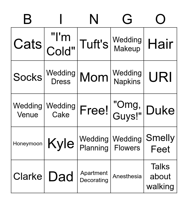 This bingo card has a free space and 24 words: Kyle, Dad, Mom, Clarke, Hair, Cats, Socks, "I'm Cold", "Omg, Guys!", Wedding Planning, Wedding Napkins, Wedding Venue, Wedding Flowers, Smelly Feet, Wedding Dress, Anesthesia, Duke, Tuft's, URI, Wedding Cake, Talks about walking, Honeymoon, Wedding Makeup and Apartment Decorating.