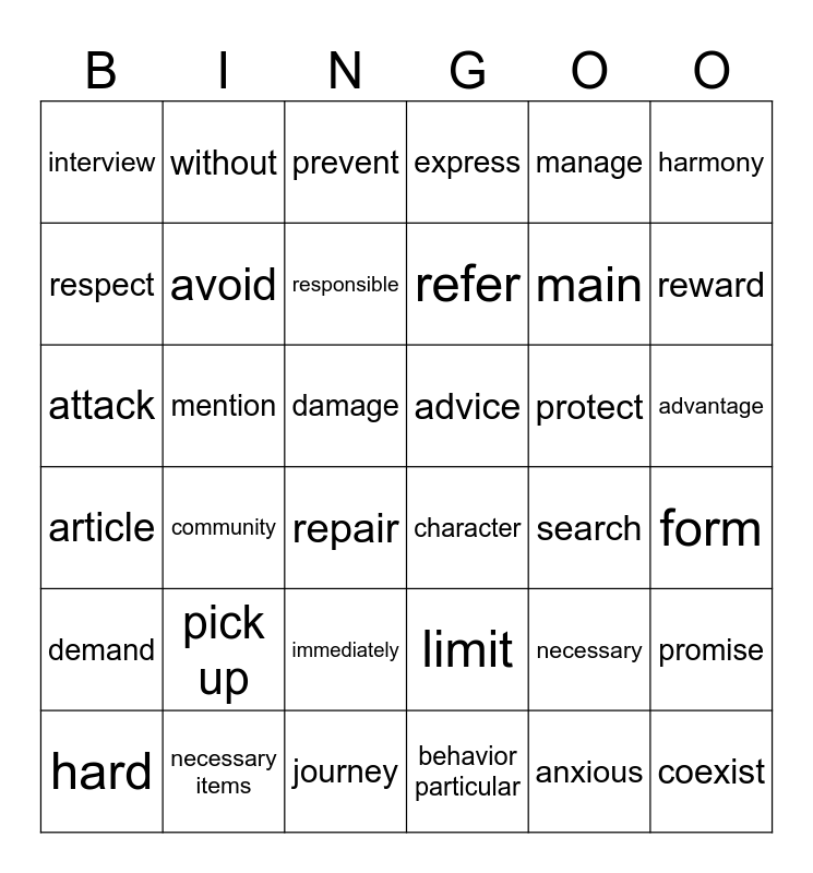 This bingo card has 36 words: limit, immediately, behavior particular, respect, article, advice, avoid, journey, manage, necessary, reward, express, promise, mention, refer, interview, demand, protect, attack, prevent, damage, community, character, repair, search, without, main, necessary items, responsible, harmony, coexist, hard, form, advantage, pick up and anxious.