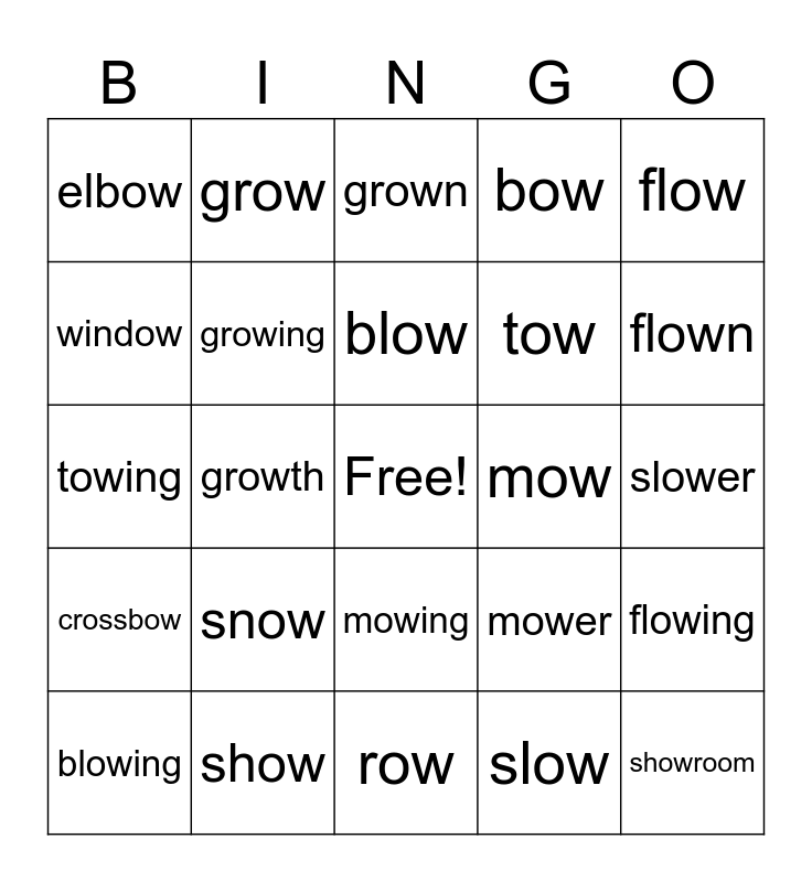 This bingo card has a free space and 24 words: snow, show, blow, blowing, flow, elbow, window, grow, mow, mowing, tow, towing, mower, flowing, growing, slow, slower, grown, flown, growth, showroom, crossbow, bow and row.