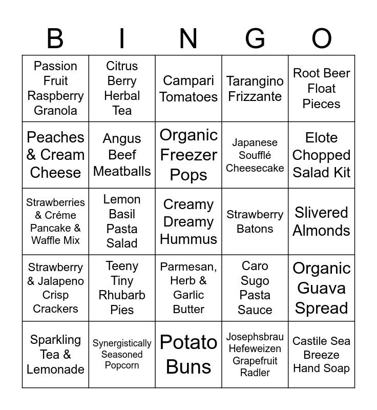 This bingo card has 25 words: Teeny Tiny Rhubarb Pies, Potato Buns, Organic Freezer Pops, Sparkling Tea & Lemonade, Root Beer Float Pieces, Passion Fruit Raspberry Granola, Peaches & Cream Cheese, Citrus Berry Herbal Tea, Strawberry Batons, Parmesan, Herb & Garlic Butter, Japanese Soufflé Cheesecake, Strawberries & Créme Pancake & Waffle Mix, Caro Sugo Pasta Sauce, Organic Guava Spread, Angus Beef Meatballs, Castile Sea Breeze Hand Soap, Slivered Almonds, Campari Tomatoes, Elote Chopped Salad Kit, Lemon Basil Pasta Salad, Creamy Dreamy Hummus, Synergistically Seasoned Popcorn, Strawberry & Jalapeno Crisp Crackers, Tarangino Frizzante and Josephsbrau Hefeweizen Grapefruit Radler.