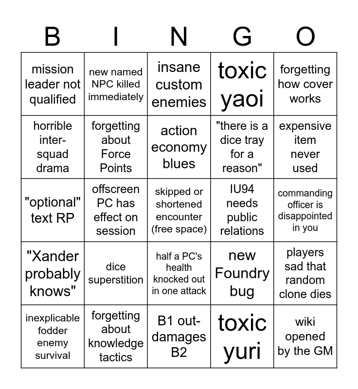 This bingo card has a free space and 24 words: dice superstition, forgetting about knowledge tactics, action economy blues, inexplicable fodder enemy survival, forgetting how cover works, mission leader not qualified, horrible inter-squad drama, new named NPC killed immediately, IU94 needs public relations, half a PC's health knocked out in one attack, "there is a dice tray for a reason", "optional" text RP, new Foundry bug, players sad that random clone dies, forgetting about Force Points, toxic yuri, commanding officer is disappointed in you, insane custom enemies, expensive item never used, offscreen PC has effect on session, wiki opened by the GM, "Xander probably knows", toxic yaoi and B1 out-damages B2.