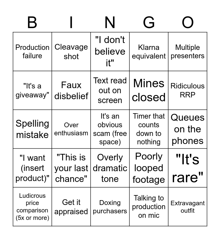 This bingo card has a free space and 24 words: "This is your last chance", Get it appraised, Text read out on screen, Ludicrous price comparison (5x or more), Multiple presenters, Production failure, "It's a giveaway", Cleavage shot, Timer that counts down to nothing, Overly dramatic tone, Mines closed, Spelling mistake, Poorly looped footage, "It's rare", Faux disbelief, Talking to production on mic, Queues on the phones, "I don't believe it", Ridiculous RRP, Over enthusiasm, Extravagant outfit, "I want (insert product)", Klarna equivalent and Doxing purchasers.