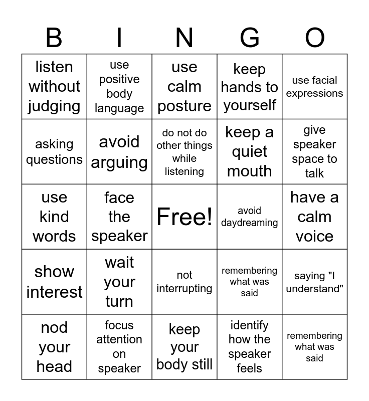 This bingo card has a free space and 24 words: wait your turn, focus attention on speaker, do not do other things while listening, nod your head, use facial expressions, listen without judging, asking questions, use positive body language, avoid daydreaming, not interrupting, keep a quiet mouth, use kind words, remembering what was said, saying "I understand", avoid arguing, identify how the speaker feels, have a calm voice, use calm posture, give speaker space to talk, face the speaker, remembering what was said, show interest, keep hands to yourself and keep your body still.