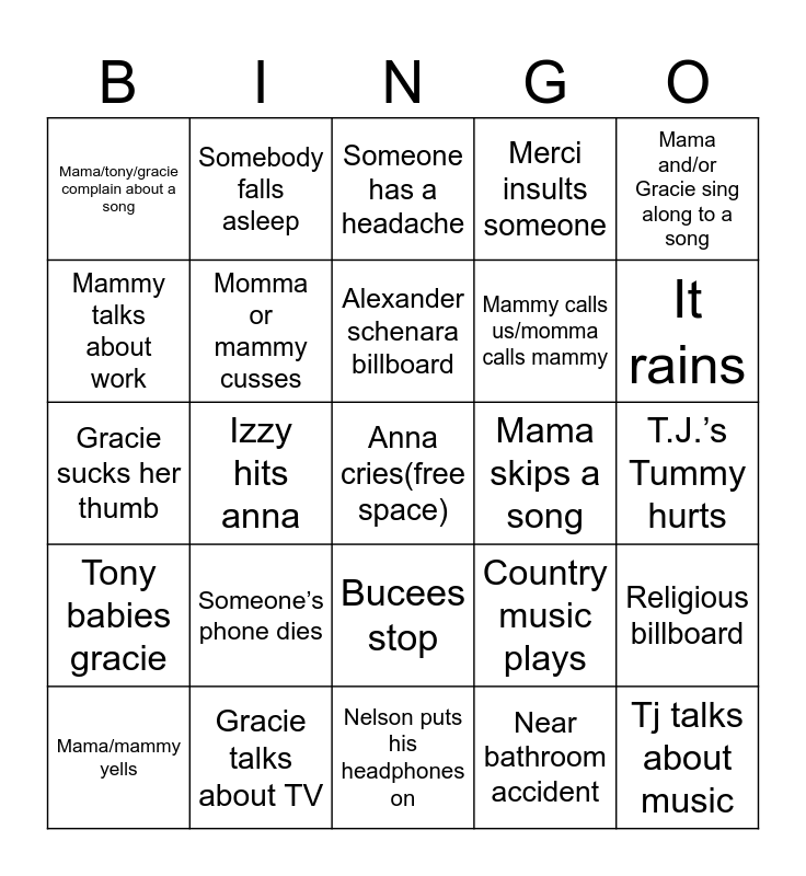 This bingo card has a free space and 24 words: Someone’s phone dies, Gracie talks about TV, Alexander schenara billboard, Mama/mammy yells, Mama and/or Gracie sing along to a song, Mama/tony/gracie complain about a song, Mammy talks about work, Somebody falls asleep, Mama skips a song, Bucees stop, Mammy calls us/momma calls mammy, Gracie sucks her thumb, Country music plays, Religious billboard, Momma or mammy cusses, Near bathroom accident, T.J.’s Tummy hurts, Someone has a headache, It rains, Izzy hits anna, Tj talks about music, Tony babies gracie, Merci insults someone and Nelson puts his headphones on.