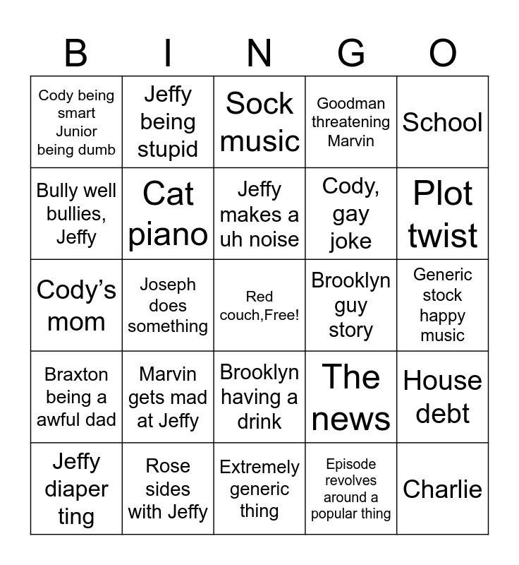 This bingo card has a free space and 24 words: Marvin gets mad at Jeffy, Rose sides with Jeffy, Jeffy makes a uh noise, Jeffy diaper ting, School, Cody being smart Junior being dumb, Bully well bullies, Jeffy, Jeffy being stupid, Brooklyn guy story, Brooklyn having a drink, Cody, gay joke, Cody’s mom, The news, House debt, Cat piano, Episode revolves around a popular thing, Generic stock happy music, Sock music, Plot twist, Joseph does something, Charlie, Braxton being a awful dad, Goodman threatening Marvin and Extremely generic thing.