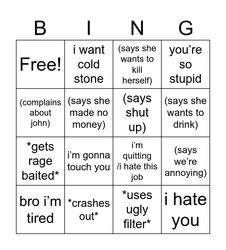 This bingo card has 16 words: bro i’m tired, *crashes out*, (says she wants to kill herself), you’re so stupid, (complains about john), i want cold stone, i’m quitting /i hate this job, (says we’re annoying), Free!, (says she made no money), *uses ugly filter*, (says she wants to drink), *gets rage baited*, i’m gonna touch you, (says shut up) and i hate you.