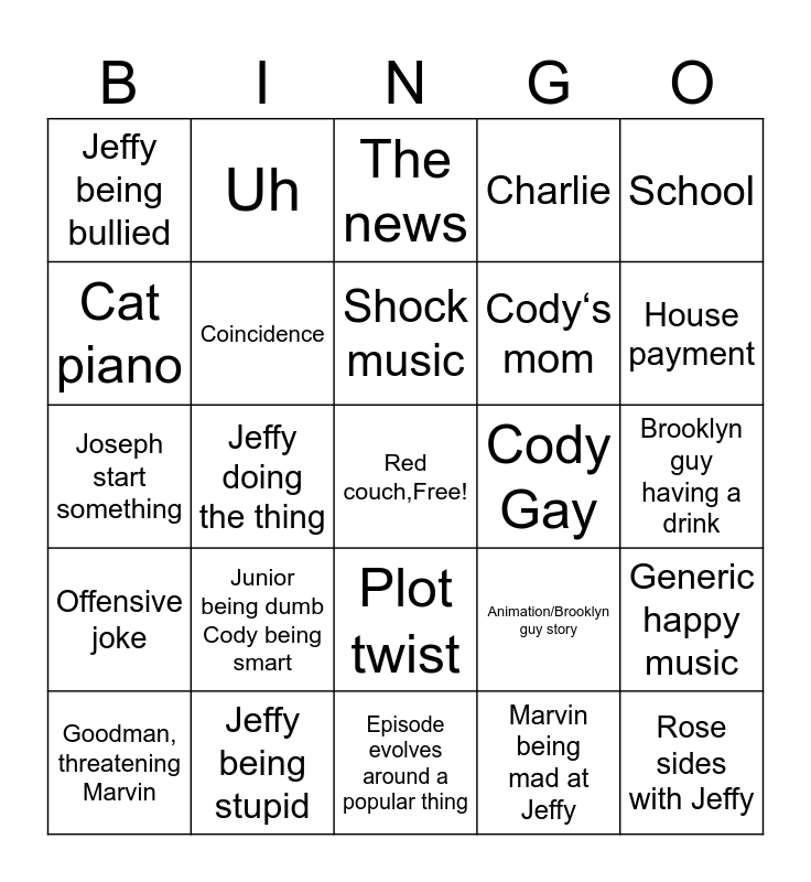 This bingo card has a free space and 24 words: Junior being dumb Cody being smart, Jeffy being stupid, Shock music, Goodman, threatening Marvin, School, Jeffy being bullied, Cat piano, Uh, Cody Gay, Plot twist, Cody‘s mom, Joseph start something, Animation/Brooklyn guy story, Generic happy music, Coincidence, Marvin being mad at Jeffy, Brooklyn guy having a drink, The news, House payment, Jeffy doing the thing, Rose sides with Jeffy, Offensive joke, Charlie and Episode evolves around a popular thing.