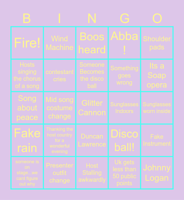 This bingo card has 25 words: Thanking the host country for a wonderful evening, Host Stalling awkwardly, Someone Becomes the disco ball, someone is on stage...we cant figure out why, Shoulder pads, Fire!, Hosts singing the chorus of a song, Wind Machine, Sunglasses Indoors, Duncan Lawrence, Something goes wrong, Song about peace, Disco ball!, Fake Instrument, contestant cries, Johnny Logan, Sunglasses worn inside, Boos heard, Its a Soap opera, Mid song costume change, Glitter Cannon, Presenter outfit change, Fake rain, Abba ! and Uk gets less than 50 public points.