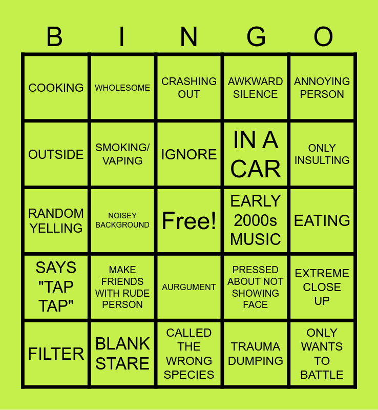 This bingo card has a free space and 24 words: MAKE FRIENDS WITH RUDE PERSON, BLANK STARE, IGNORE, FILTER, ANNOYING PERSON, COOKING, OUTSIDE, WHOLESOME, EARLY 2000s MUSIC, AURGUMENT, IN A CAR, RANDOM YELLING, PRESSED ABOUT NOT SHOWING FACE, EXTREME CLOSE UP, SMOKING/ VAPING, TRAUMA DUMPING, EATING, CRASHING OUT, ONLY INSULTING, NOISEY BACKGROUND, ONLY WANTS TO BATTLE, SAYS "TAP TAP", AWKWARD SILENCE and CALLED THE WRONG SPECIES.