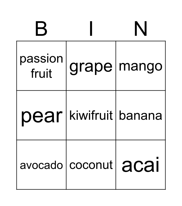 This bingo card has a free space and 8 words: banana, mango, grape, avocado, passion fruit, acai, pear and coconut.