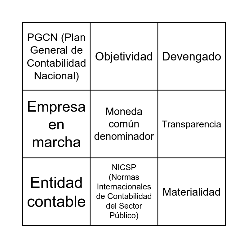 This bingo card has 9 words: Entidad contable, Devengado, Objetividad, Empresa en marcha, PGCN (Plan General de Contabilidad Nacional), Transparencia, Moneda común denominador, Materialidad and NICSP (Normas Internacionales de Contabilidad del Sector Público).