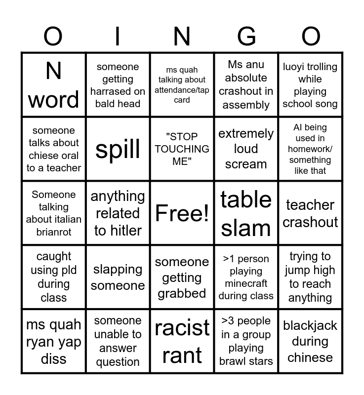 This bingo card has a free space and 24 words: slapping someone, someone unable to answer question, "STOP TOUCHING ME", ms quah ryan yap diss, luoyi trolling while playing school song, N word, someone talks about chiese oral to a teacher, someone getting harrased on bald head, table slam, someone getting grabbed, extremely loud scream, Someone talking about italian brianrot, >1 person playing minecraft during class, trying to jump high to reach anything, spill, >3 people in a group playing brawl stars, teacher crashout, ms quah talking about attendance/tap card, AI being used in homework/ something like that, anything related to hitler, blackjack during chinese, caught using pld during class, Ms anu absolute crashout in assembly and racist rant.