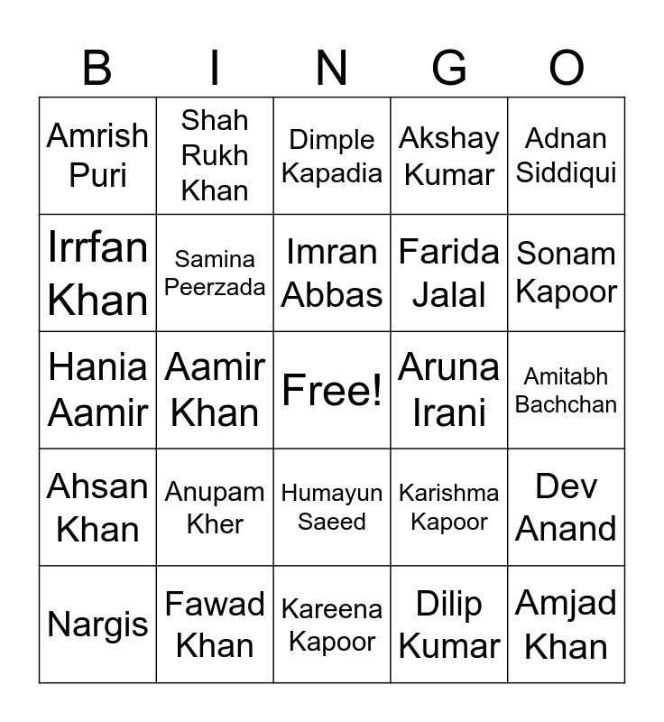 This bingo card has a free space and 40 words: Mahira Khan, Hania Aamir, Sanam Saeed, Samina Peerzada, Fawad Khan, Humayun Saeed, Imran Abbas, Jawed Sheikh, Adnan Siddiqui, Ahsan Khan, Aamir Khan, Akshay Kumar, Amjad Khan, Amitabh Bachchan, Aruna Irani, Anupam Kher, Anil Kapoor, Amrish Puri, Deepika Padukone, Dimple Kapadia, Dev Anand, Dilip Kumar, Farida Jalal, Irrfan Khan, Rekha, Kajol, Juhi Chawla, Sri Devi, Madhuri Dixit, Madhubala, Meena Kumari, Nargis, Raveena Tandun, Karishma Kapoor, Sonam Kapoor, Kareena Kapoor, Shabana Azmi, Saif Ali Khan, Shah Rukh Khan and Tabu.