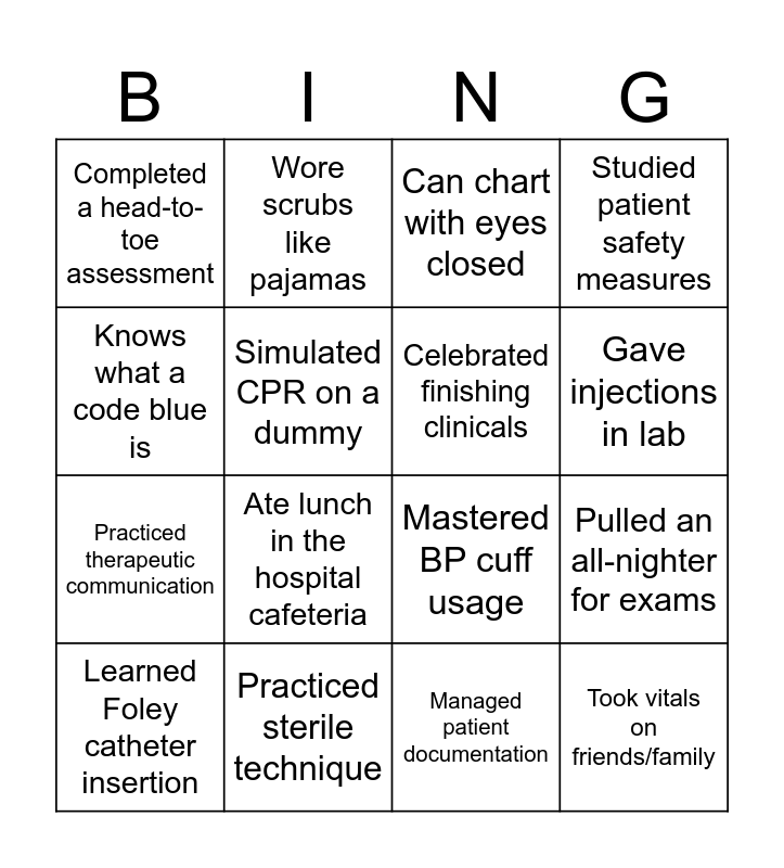 This bingo card has 33 words: Free!, Memorized medical abbreviations, Pulled an all-nighter for exams, Practiced IV starts on a dummy arm, Took vitals on friends/family, Celebrated finishing clinicals, Knows what a code blue is, Learned med dosage calculations, Wore scrubs like pajamas, Survived pharmacology, Gave injections in lab, Can chart with eyes closed, Has a favorite stethoscope, Did simulation with mannequins, Practiced sterile technique, Ate lunch in the hospital cafeteria, Learned patient handoff reports, Mastered BP cuff usage, Practiced wound dressing changes, Knows NG vs OG tubes, Learned to read EKGs, Spent hours writing care plans, Completed a head-to-toe assessment, Managed patient documentation, Administered oral medications, Learned Foley catheter insertion, Studied patient safety measures, Practiced therapeutic communication, Simulated CPR on a dummy, Wore compression socks for 12 hours, Shadowed a nurse preceptor, Passed dosage calculation exams and Attended nursing pinning ceremony.