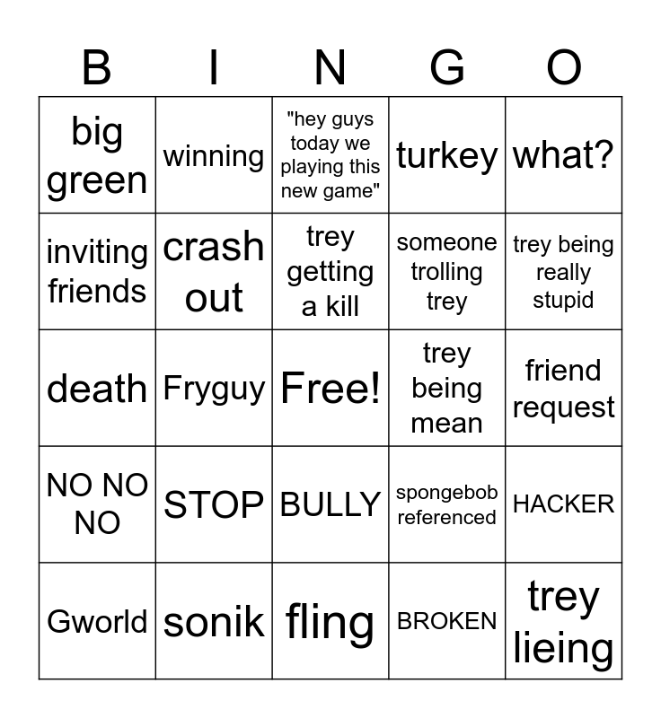 This bingo card has a free space and 24 words: STOP, sonik, trey getting a kill, Gworld, what?, big green, inviting friends, winning, trey being mean, BULLY, someone trolling trey, death, spongebob referenced, HACKER, crash out, BROKEN, friend request, "hey guys today we playing this new game", trey being really stupid, Fryguy, trey lieing, NO NO NO, turkey and fling.