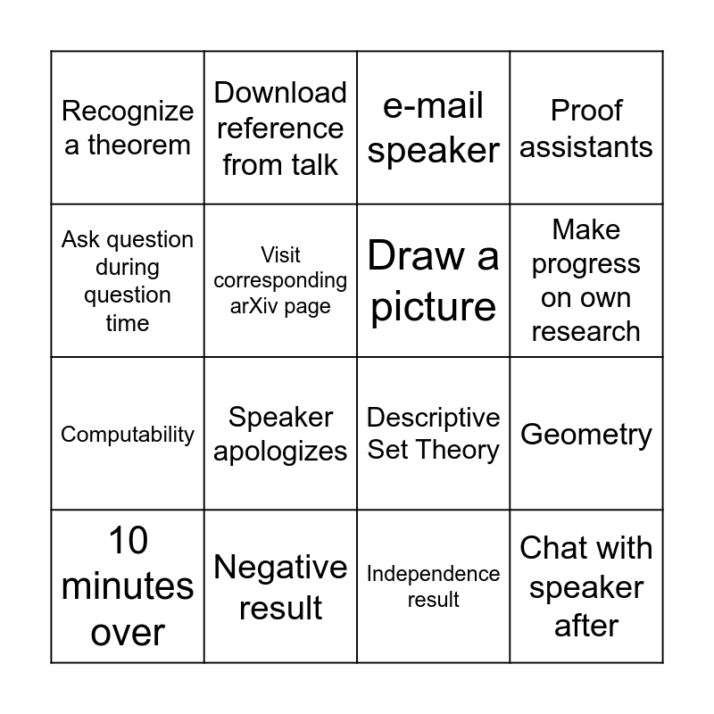 This bingo card has 26 words: Find 2 typos, Ask question during talk, Make progress on own research, Complete an exercise, Ask question during question time, Recognize a theorem, Visit corresponding arXiv page, Download reference from talk, Independence result, Combinatorics, Computability, Descriptive Set Theory, Philosophy, Model Theory, Geometry, Nonclassical logic, Proof assistants, Chat with speaker after, e-mail speaker, 10 minutes over, Speaker apologizes, Def'n, Thm, Example, Negative result, Positive result, Draw a picture and Run out of coffee.