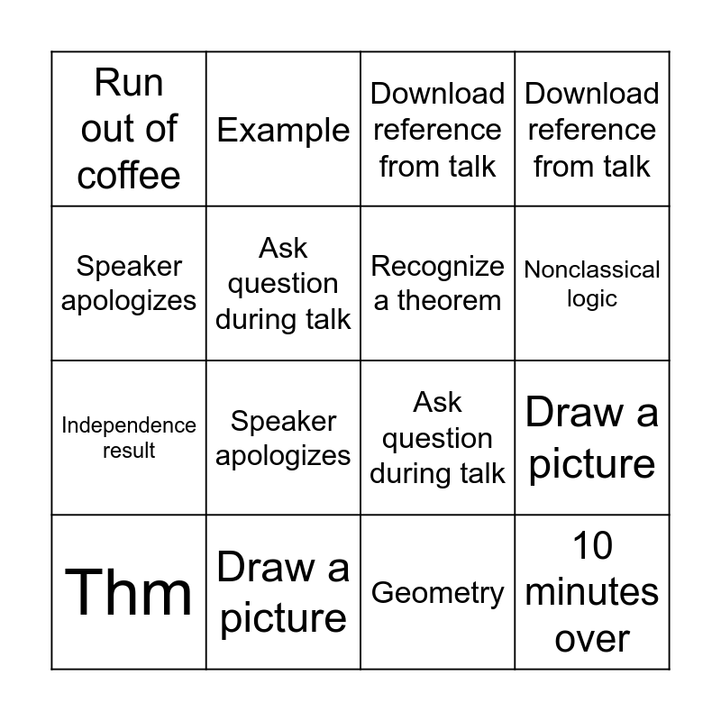⚠ This card has duplicate items: Make progress on own research (2), 10 minutes over (2), Combinatorics (2), Chat with speaker after (2), Find 2 typos (2), Descriptive Set Theory (2), Download reference from talk (2), e-mail speaker (2), Ask question during talk (2), Proof assistants (2), Run out of coffee (2), Recognize a theorem (2), Positive result (2), Negative result (2), Model Theory (2), Independence result (2), Computability (2), Geometry (2), Complete an exercise (2), Nonclassical logic (2), Draw a picture (2), Speaker apologizes (2), Ask question during question time (2), Visit corresponding arXiv page (2), Philosophy (2)