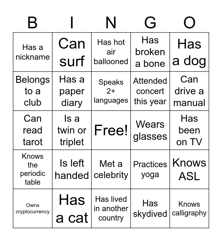 This bingo card has a free space and 26 words: Met a celebrity, Has skydived, Speaks 2+ languages, Has a cat, Has a dog, Has a nickname, Belongs to a club, Can surf, Has been on TV, Practices yoga, Attended concert this year, Can read tarot, Knows ASL, Owns cryptocurrency, Is a twin or triplet, Can knit or crochet, Has broken a bone, Knows the periodic table, Has hot air ballooned, Knows calligraphy, Can drive a manual, Has lived in another country, Wears glasses, Is left handed, Has a paper diary and Can do a cartwheel.