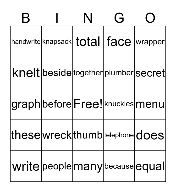This bingo card has a free space and 24 words: wreck, people, together, write, wrapper, handwrite, knelt, knapsack, knuckles, thumb, plumber, graph, telephone, does, beside, because, menu, total, secret, before, equal, these, face and many.