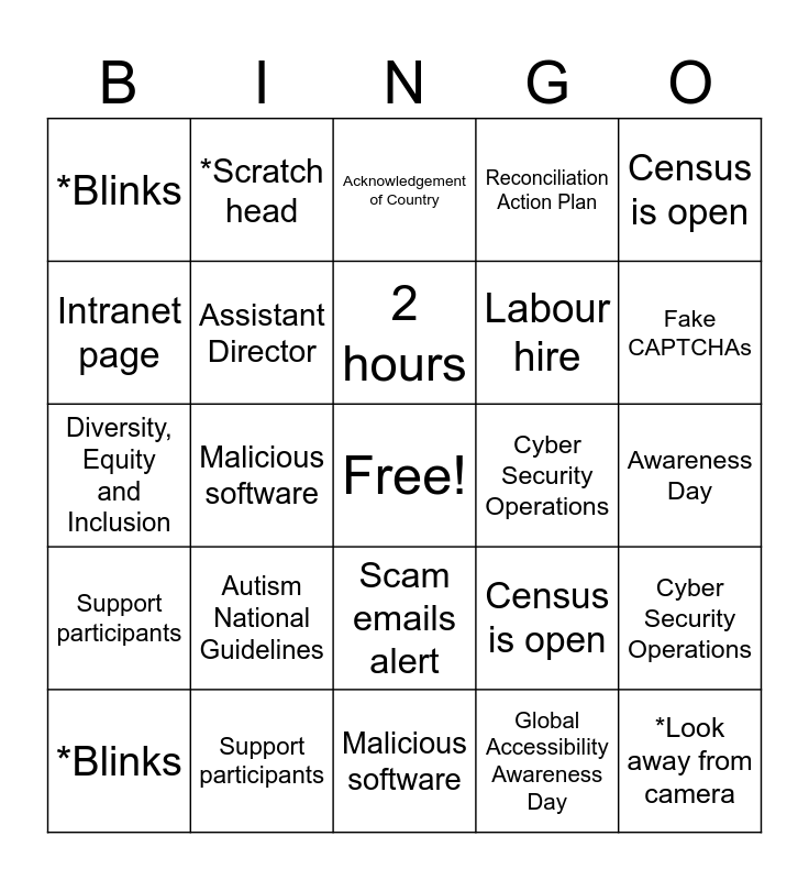 This bingo card has a free space and 45 words: *Scratch head, *Look away from camera, *Takes a drink, *Blinks, *Changes background, Global Accessibility Awareness Day, Acknowledgement of Country, Digital access and inclusion, Census is open, Support participants, Reconciliation Action Plan, Cyber Security Operations, Scam emails alert, Autism National Guidelines, Quarterly meetings, Malicious software, Celebrate GAAD, Diversity, Equity and Inclusion, Unique Census link, Fake CAPTCHAs, *Scratch head, *Look away from camera, *Takes a drink, *Blinks, *Changes background, Awareness Day, Acknowledgement of Country, Digital access and inclusion, Census is open, Support participants, Action Plan, Cyber Security Operations, Scam emails alert, National Guidelines, Quarterly meetings, Malicious software, Anonymous feedback, Unique Census link, Fake CAPTCHAs, 2 hours, Intranet page, Labour hire, People and Culture service desk, Assistant Director and Research Institute.