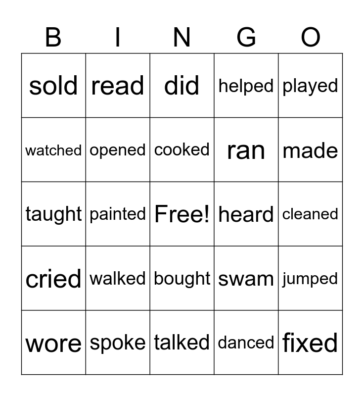 This bingo card has a free space and 24 words: walked, spoke, cooked, wore, played, sold, watched, read, heard, bought, ran, taught, swam, jumped, opened, danced, cleaned, did, made, painted, fixed, cried, helped and talked.