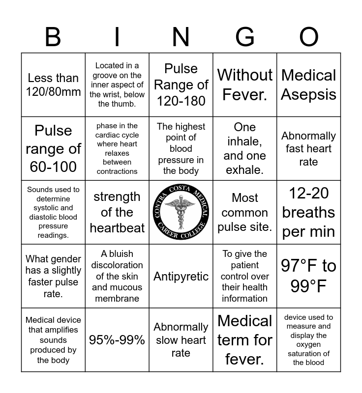 This bingo card has a free space and 28 words: 97°F to 99°F, Vague sense of body discomfort, weakness, and fatigue., One inhale, and one exhale., Medical term for fever., Pulse range of 60-100, Pulse Range of 120-180, Located in a groove on the inner aspect of the wrist, below the thumb., What gender has a slightly faster pulse rate., Most common pulse site., Medical device that amplifies sounds produced by the body, Sounds used to determine systolic and diastolic blood pressure readings., Without Fever., 95%-99%, Abnormally slow heart rate, Abnormally fast heart rate, Hyperventilation, A bluish discoloration of the skin and mucous membrane, phase in the cardiac cycle where heart relaxes between contractions, The highest point of blood pressure in the body, Antipyretic, Less than 120/80mm, irregularity in heartbeat, device used to measure and display the oxygen saturation of the blood, strength of the heartbeat, 12-20 breaths per min, To give the patient control over their health information, Medical Asepsis and The process of cleansing or sanitizing hands.