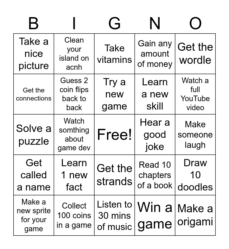 This bingo card has a free space and 24 words: Learn 1 new fact, Collect 100 coins in a game, Try a new game, Make a new sprite for your game, Get the wordle, Take a nice picture, Get the connections, Clean your island on acnh, Hear a good joke, Get the strands, Learn a new skill, Solve a puzzle, Read 10 chapters of a book, Draw 10 doodles, Guess 2 coin flips back to back, Win a game, Make someone laugh, Take vitamins, Watch a full YouTube video, Watch somthing about game dev, Make a origami, Get called a name, Gain any amount of money and Listen to 30 mins of music.