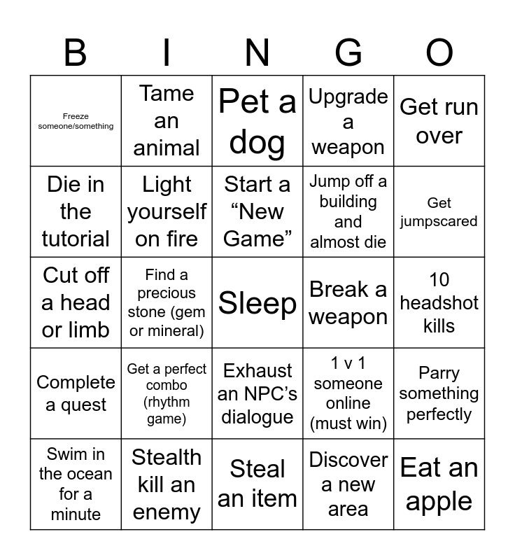 This bingo card has 75 words: Purchase a vehicle, Purchase a gun, Pet a dog, Catch a fish, Do a flip (Front or back), Blow something up, Permanently kill an important NPC, Watch a full cutscene, Cook a meal, Flip a car, Eat an apple, Punch someone in the face, Start a “New Game”, Die in the tutorial, Kill a boss, Find a precious stone (gem or mineral), Craft something, Sleep, Hunt/Kill an animal, Get run over, Play a game within a game, Cut off a head or limb, Light yourself on fire, Tame an animal, Upgrade a weapon, Level up, Survive to top 10 in a battle royale, Cast a spell, Crash the game, Softlock yourself, Kill a dragon, Sell an item, Run out of ammo, 1 v 1 someone online (must win), Get jumpscared, Jump off a building and almost die, Fill your inventory, Crash a plane into someone, 10 headshot kills, Discover a new area, Read a book cover to cover, Wall run, Execute a speedrun skip, Lose lots of progress, Get eaten, Watch TV, Swim in the ocean for a minute, Freeze someone/something, Make Homer Simpson in a character creator, Dig a hole, Pass the first floor/level, Exhaust an NPC’s dialogue, Build a house, Get $10000 in game, Starve to death, Get a job, 100% a level, Get wasted/high in game, Clean something, Win a race, Get a perfect combo (rhythm game), Get a haircut, Cut down a tree, Collect an important story item, Serve a customer, Break a weapon, Recruit someone, Play an instrument, Kill 3 enemies without taking damage, Parry something perfectly, Complete a quest, Stealth kill an enemy, Roll a die, Steal an item and Cure yourself/someone else from a disease.