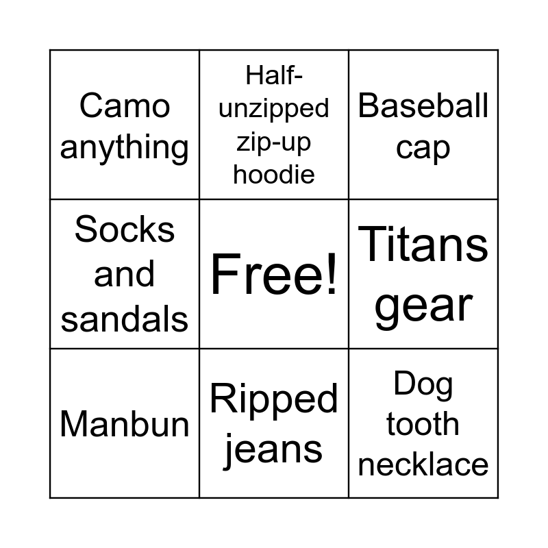This bingo card has a free space and 8 words: Socks and sandals, Half-unzipped zip-up hoodie, Titans gear, Manbun, Baseball cap, Camo anything, Ripped jeans and Dog tooth necklace.