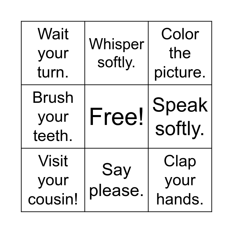 This bingo card has a free space and 104 words: Sit down., Stand up., Clap your hands., Jump high., Run fast., Walk slowly., Raise your hand., Touch your nose., Point to the door., Wave hello., Smile big., Say your name., Count to ten., Sing a song., Draw a cat., Write your name., Color the picture., Cut the paper., Glue the pieces., Fold the paper., Open the book., Close the book., Turn the page., Pick a color., Eat your lunch., Drink your water., Wash your hands., Brush your teeth., Comb your hair., Tie your shoes., Put on your hat., Take off your coat., Catch the ball., Throw the ball., Kick the ball., Drop the toy., Pick up the toy., Help your friend., Say please., Say thank you., Look at the board., Listen carefully., Be quiet., Speak softly., Line up., Wait your turn., Raise your arm., Shake your head., Nod your head., Take a deep breath., Hold your hand., Wave goodbye., Clean your desk., Push the chair., Pull the door., Sit in a circle., Share your toy., Wait for me., Smile at me., Dance with me., Jump in place., Skip around., Hop on one foot., Spin around., Count to five., Clap three times., Sing loudly., Whisper softly., Stretch your arms., Bend your knees., Touch your toes., Sit cross-legged., Blink your eyes., Snap your fingers., Pat your head., Tap your feet., Wave your arms., March in place., Stomp your feet., Kick the ball!, Go to the door!, Find a friend!, Visit your cousin!, Close the window!, Grab the book!, Follow the leader!, Vacuum the floor!, Catch the toy!, Give me the pen!, Fix the problem!, Vote for a leader!, Clap your hands!, Get your coat!, Feed the cat!, Vacate the seat!, Cook the meal!, Gather the toys!, Fold the clothes!, View the map!, Kick twice!, Go fast!, Find the key!, Visit the park! and Cut the paper!.